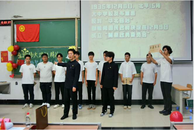 活动在激昂的《中国共青团团歌》中拉开序幕,青春之声铿锵回荡,点燃了全场的爱国热情。十二名团员青年倾情演绎武术情景短剧《青春问战》,生动再现1935年“一二·九”运动中北平学子反对“华北自治”的壮阔场景。青年们高呼“团结就是力量”,以热血之姿诠释了民族危亡之际青年一代的觉醒与担当。随后,《季律从军》的深情演绎与《游击队歌》的激昂合唱交织,将观众带回烽火连天的抗战岁月,深刻感受革命青年投身报国的赤子情怀与不屈精神。