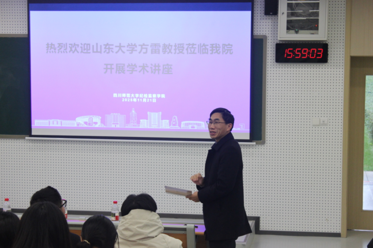 2025年11月21日下午,山东大学特聘教授、二级教授、国家级人才计划哲学社会科学领军人才方雷教授受邀莅临纪检监察学院,以《新时代国家治理的认知维度》为题开展专题学术讲座。讲座由院长李俊主持,纪检监察学院2023级、2024级全体学生到场聆听。