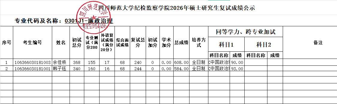 根据《四川师范大学2026年硕士研究生招生复试录取办法》,现将四川师范大学纪检监察学院2026年硕士研究生复试成绩公示如下(详见附件),公示时间:2026年4月3日-4月5日。如有异议,请向学院研究生招生督查小组实名反映。
