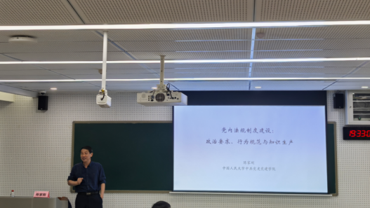 随后,陈家刚教授围绕党内法规基础理论,深入解读了党内法规的核心内涵及“1+4”体系框架,明确了党的组织法规、领导法规、自身建设法规、监督保障法规各自的内涵与适用场景。在此基础上,他梳理了党内法规制度建设的百年发展历程,详细讲解了党章的根本地位及其历史演变,系统分析了《中国共产党纪律处分条例》五版修订的逻辑变化,并结合中央八项规定精神的实践要求,阐述了新时代依规治党的重要性,还向同学们分享了学术研究与论文写作的实用方法。他叮嘱同学们,要扎实学习党内法规知识,熟练掌握纪检监察相关法律条文,打牢理论基础、提升专业本领,努力成为新时代需要的纪检监察人才。